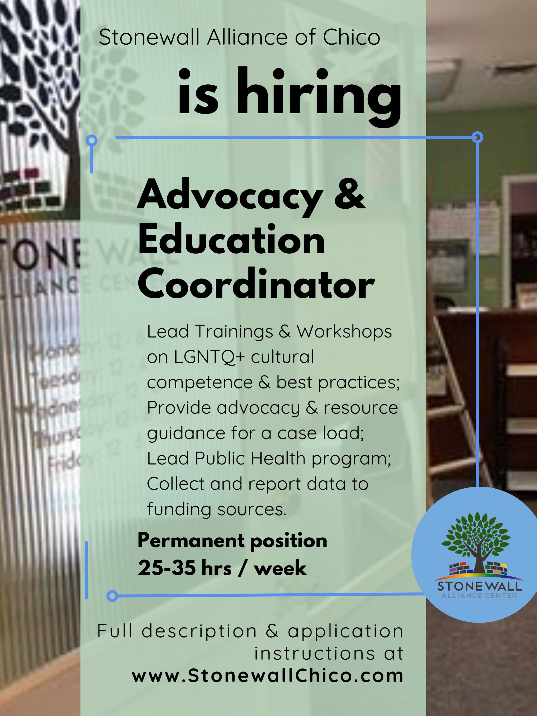 We're still looking for just the right fit for our Advocacy & Education Coordinator Role at Stonewall Chico. if you are passionate about working in direct advocacy for LGBTQ+ individuals as they navigate institutions, developing professional curriculum and facilitating trainings in Queer and Trans cultural competency, managing our Public Health programs and grant reporting, and more -- send in your resume along with a cover letter letting us understand who you are and why you're interested in this position.