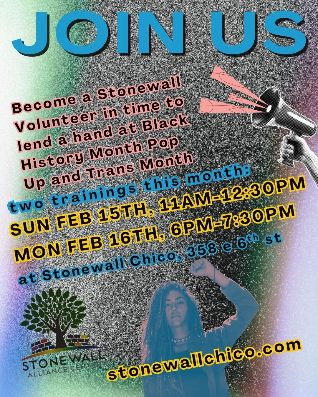 If you've been thinking about getting involved as a volunteer at Stonewall Chico, now's the time! We've got two opportunities to get trained coming up, both in time to participate as a volunteer at both the Black History Month pop-up on Feb 28, and our many Trans Month Events throughout March.