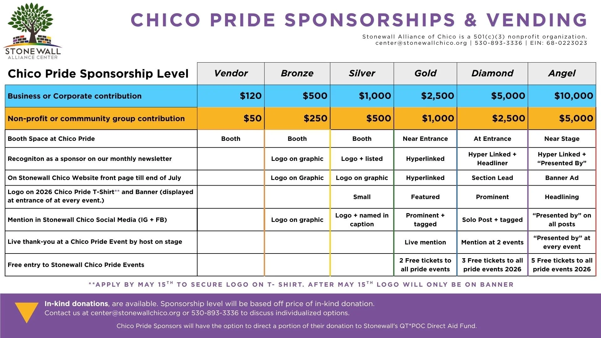 Your sponsorship helps bring this vibrant celebration to life! Support LGBTQ+ visibility, pride, and equality by becoming a sponsor of the Downtown Plaza Festival and related Pride events.NOTE: TO SECURE YOUR SPOT ON THE BACK OF OUR CHICO PRIDE T-SHIRTS AS A SPONSOR, SIGN UP AS A SILVER OR ABOVE SPONSOR BY MAY 15TH. After May 15th, our T-shirts will go to print and that perk will apply to the banner only.